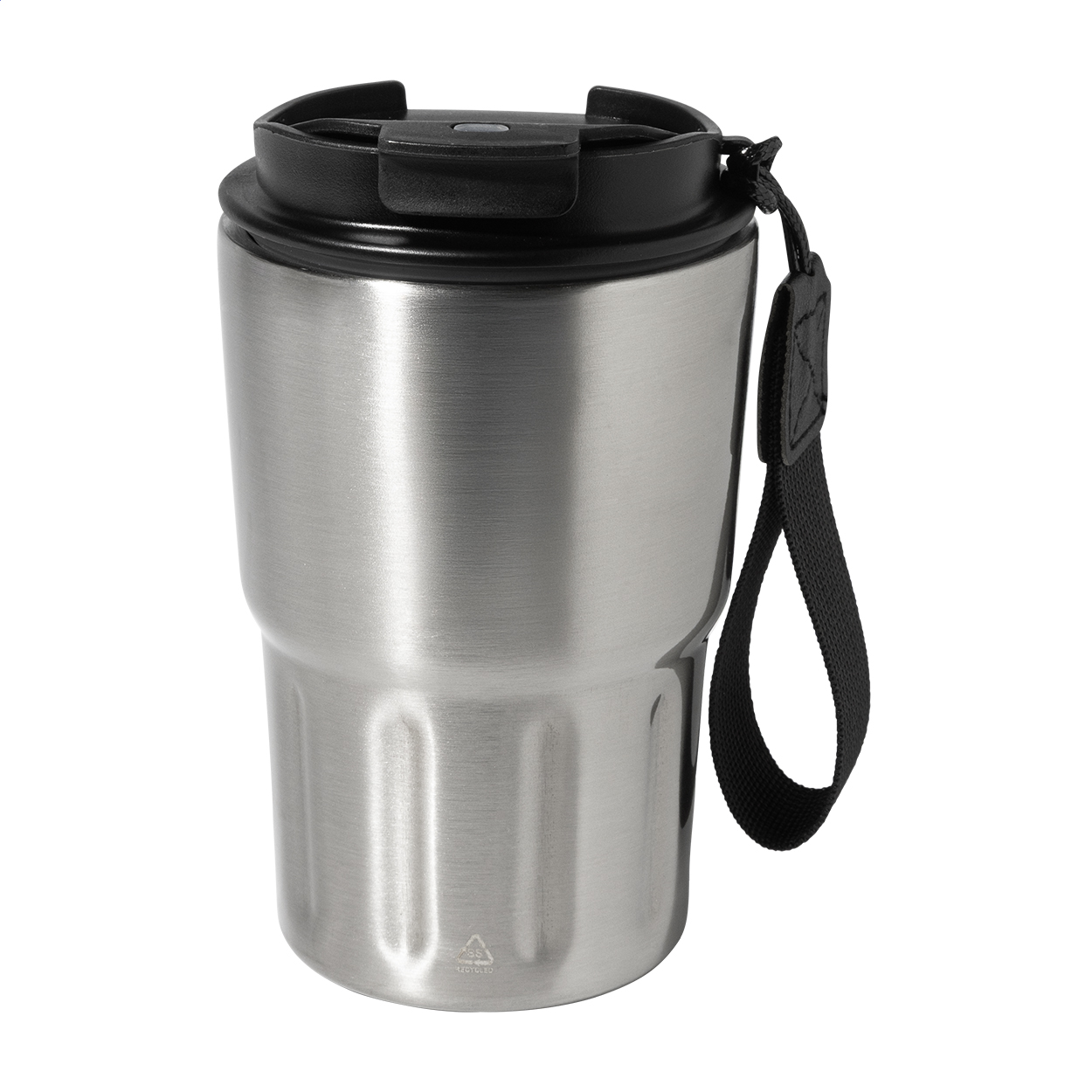 Dvoustěnný termo hrnek z recyklované nerezové oceli s izolačním víčkem z PP. S poutkem z RPET polyesteru. 350 ml.