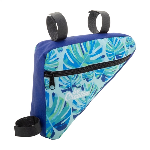 Zakázková taška na rám kola na zip z 600D RPET polyesteru s nastavitelnými popruhy na suchý zip. S celoplošnou sublimační tištěnou grafikou a výrazným štítkem RPET. – Minimální počet: 25 ks
