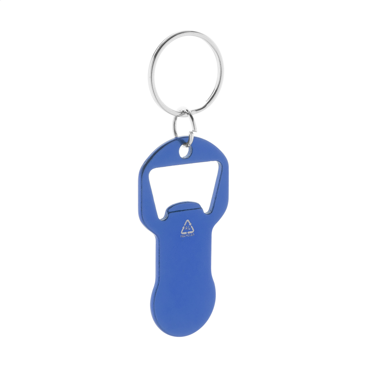 Přívěšek na klíče s otvírákem na láhve z recyklovaného hliníku s žetonem do nákupního vozíku.
