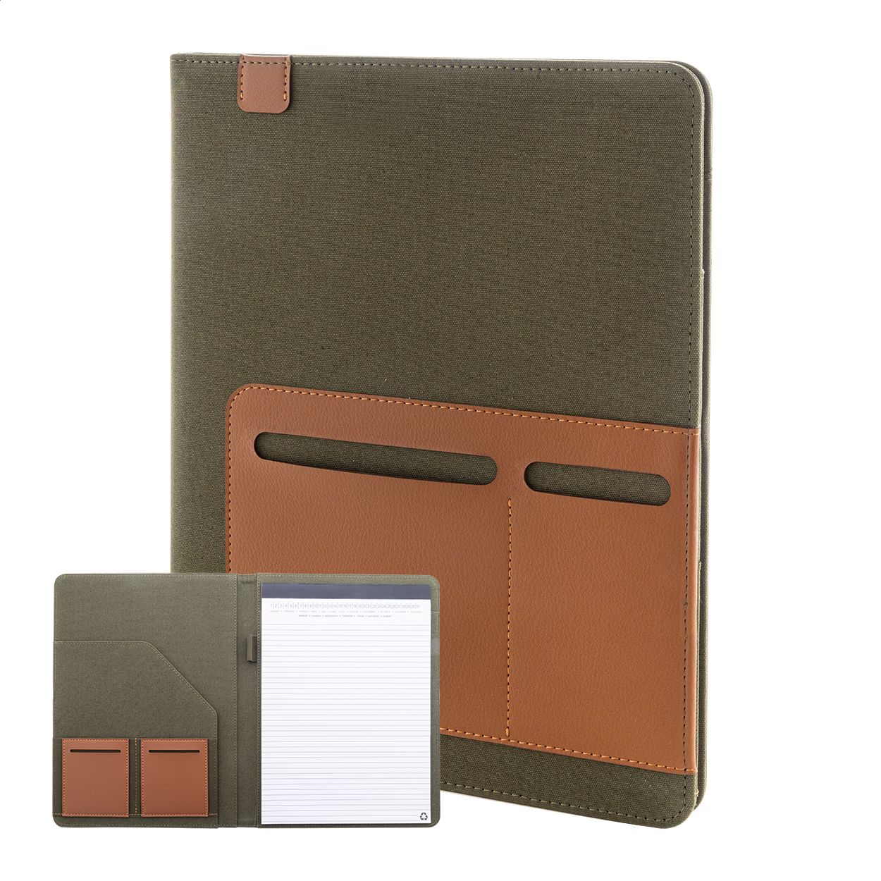Složka na dokumenty A4 z recyklovaného plátna a recyklované umělé kůže s několika předními a vnitřními kapsami. S blokem na 20 linkovaných listů z recyklovaného papíru. 70 % recyklované bavlny a 30 % RPET polyesteru.