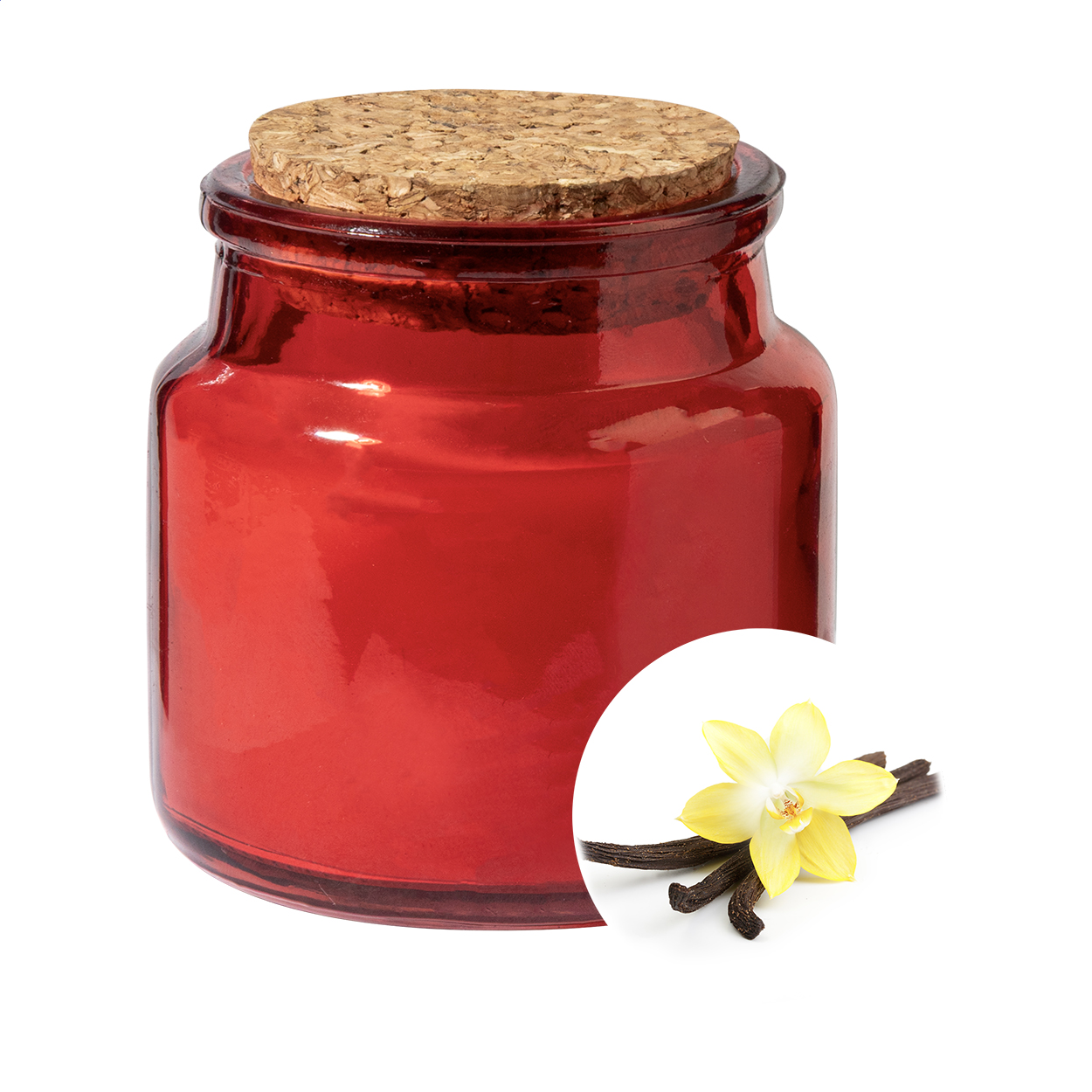 Vosková svíčka z rostlinného vosku s vůní vanilky ve skleněném svícnu s víčkem z přírodního korku. S 80 gramy vosku. Doba hoření: 16 hodin. V krabičce z kraftového papíru.