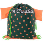 Na zakázku vyrobený vak na stažení šňůrkou ve tvaru trička s barevnými šňůrkami, 190T RPET polyester. S celoplošnou sublimační tištěnou grafikou, cena nezahrnuje tiskovou přípravu. Min. mn.: 25 ks.