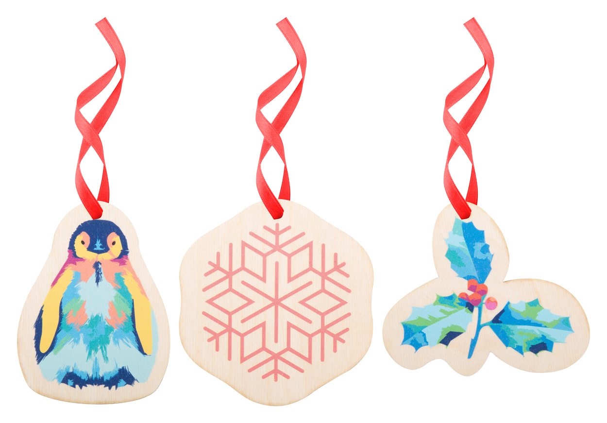 Zakázková ozdoba na vánoční stromeček z březové překližky s vlastním tvarem a plnobarevnou grafikou. Maximální rozměr: 80×80 mm. Cena je včetně UV LED tisku na jedné straně, nazahrnuje tiskovou přípravu. Dodáváno se stuhou zvlášť. Min. mn.: 100 ks.