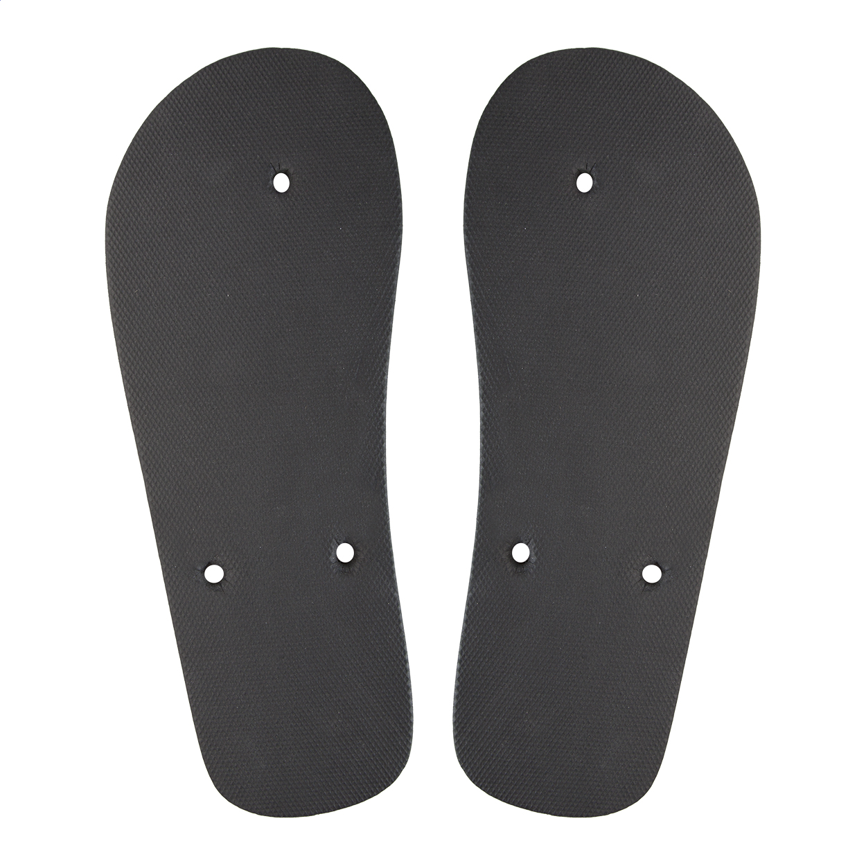 Plážové žabky na zakázku s PE podrážkou a PCV pásky. Barevnost podrážky a pásků lze na vyžádání kombinovat. Min. mn.: 50 párů/kombinace.