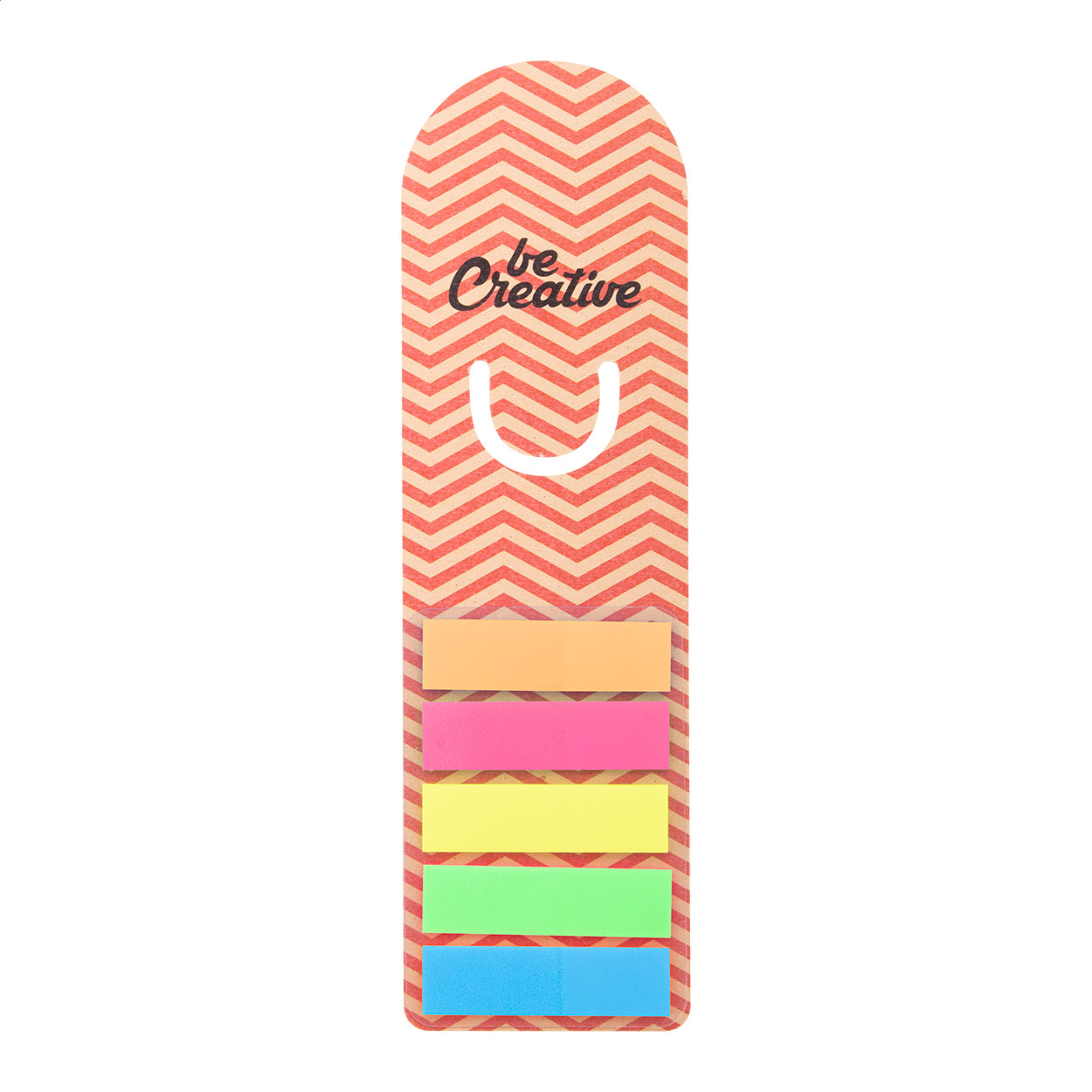 Na zakázku vyrobená záložka z recyklovaného kraftového papíru se značkovačem stránek. Obsahuje 100 plastových fóliových značkovačů stránek v 5 různých barvách (44×12 mm). Cena včetně plnobarevného potisku na přední straně, nezahrnuje tiskovou přípravu. Min. mn.: 100 ks.