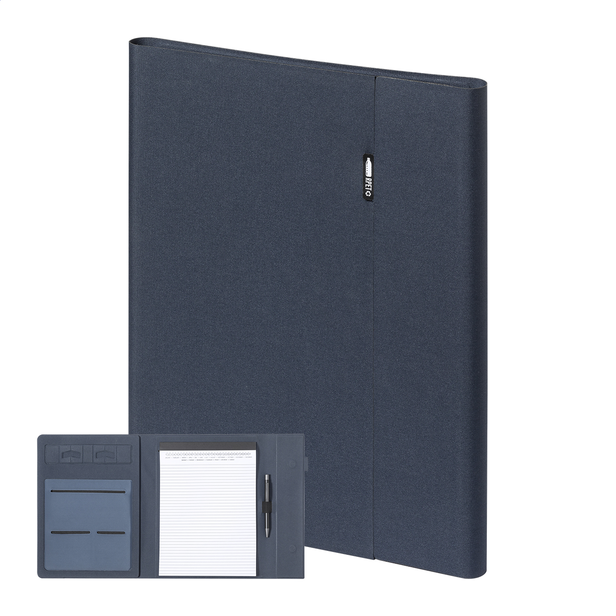 Polyesterová sloha na dokumenty A4 z 600D RPET s magnetickým zavíráním, skládacím držákem na mobil a poznámkovým blokem na 20 linkovaných listů. S výrazným štítkem RPET.
