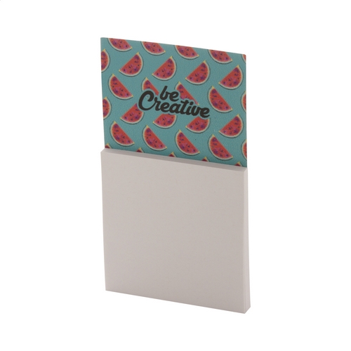 Na zakázku vyrobený, plnobarevně potištěný magnet na ledničku s lepicím blokem. Obsahuje 50 listů samolepicích lístků z recyklovaného papíru (75×75 mm). – Minimální počet: 100 ks