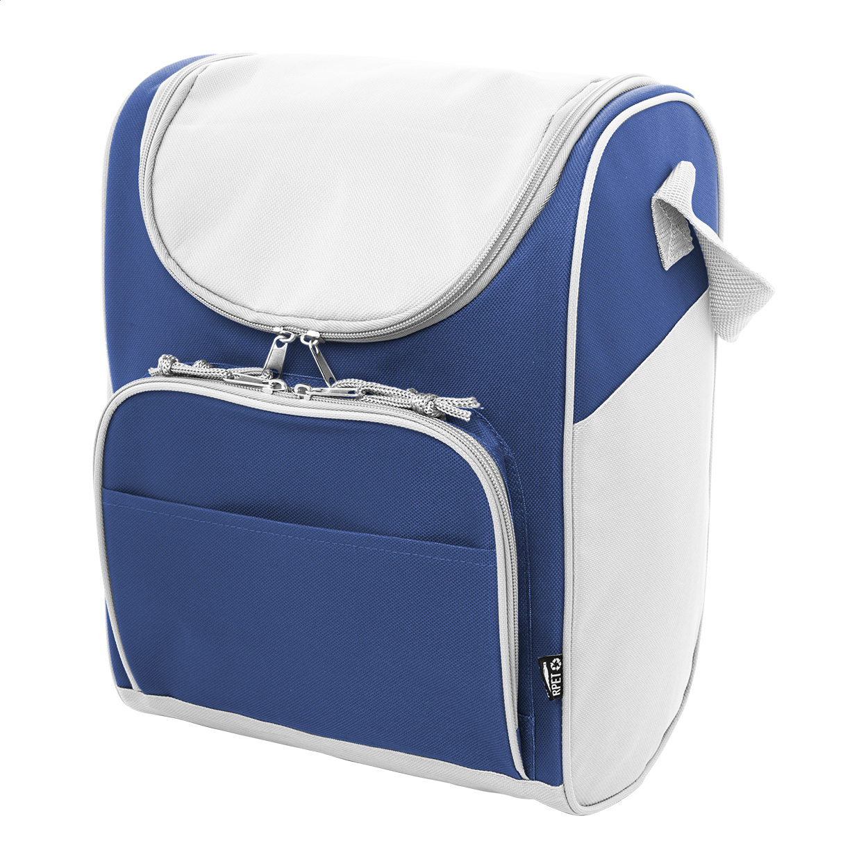Chladicí taška RPET s hliníkovým polstrováním. Se 2 přihrádkami na zip, malou přední kapsou a nastavitelným ramenním popruhem. 600D RPET polyester s výrazným štítkem RPET.