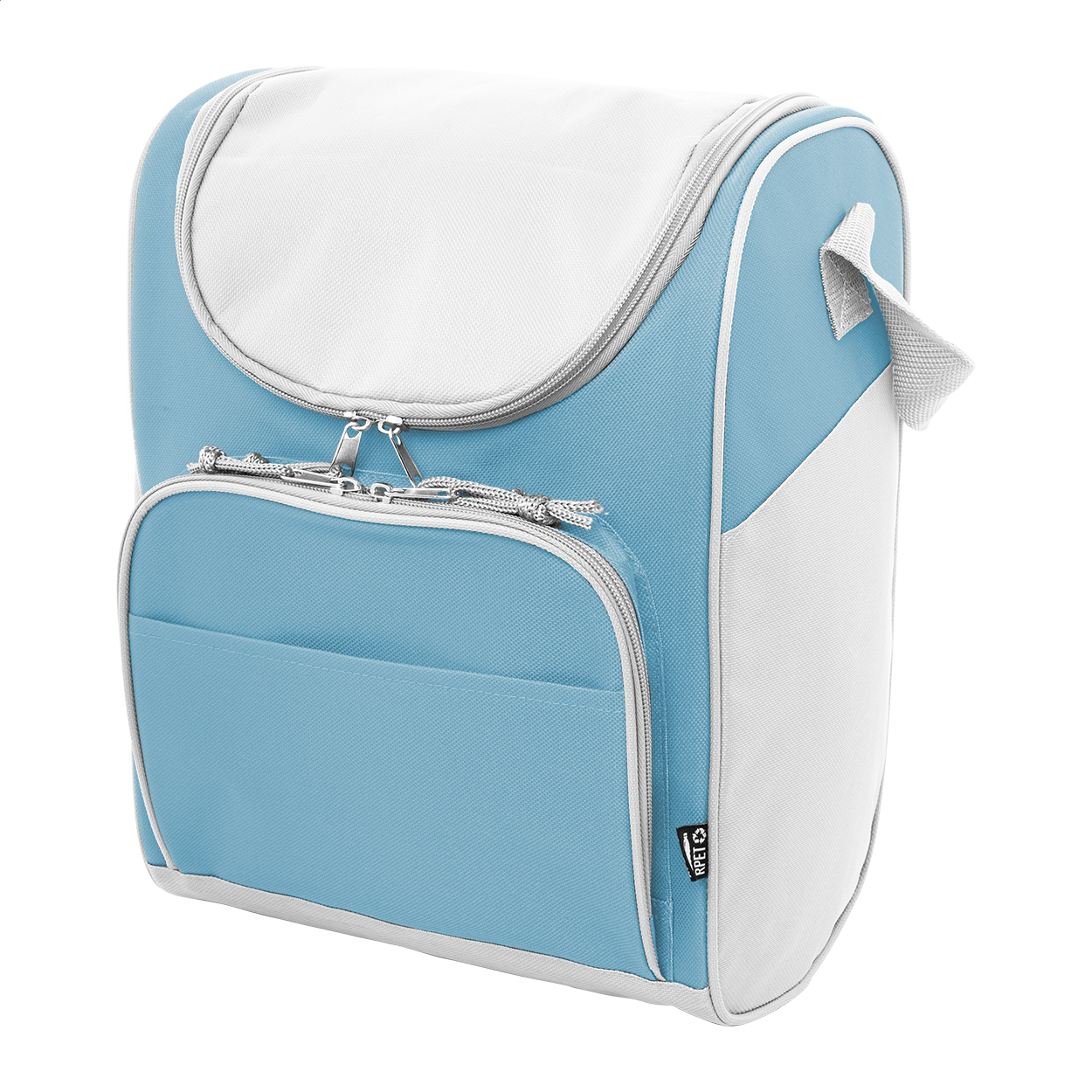 Chladicí taška RPET s hliníkovým polstrováním. Se 2 přihrádkami na zip, malou přední kapsou a nastavitelným ramenním popruhem. 600D RPET polyester s výrazným štítkem RPET.