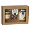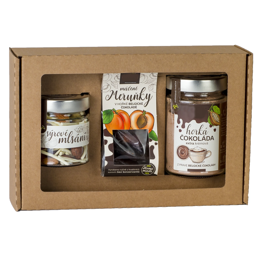 dárková sada sýrové mlsání, mix ořechů a lyofilizovaných tří druhů sýrů 80g, máčené meruňky v hořké belgické čokoládě a horká čokoláda z pravé belgické čokolády, extra krémová, 240 g