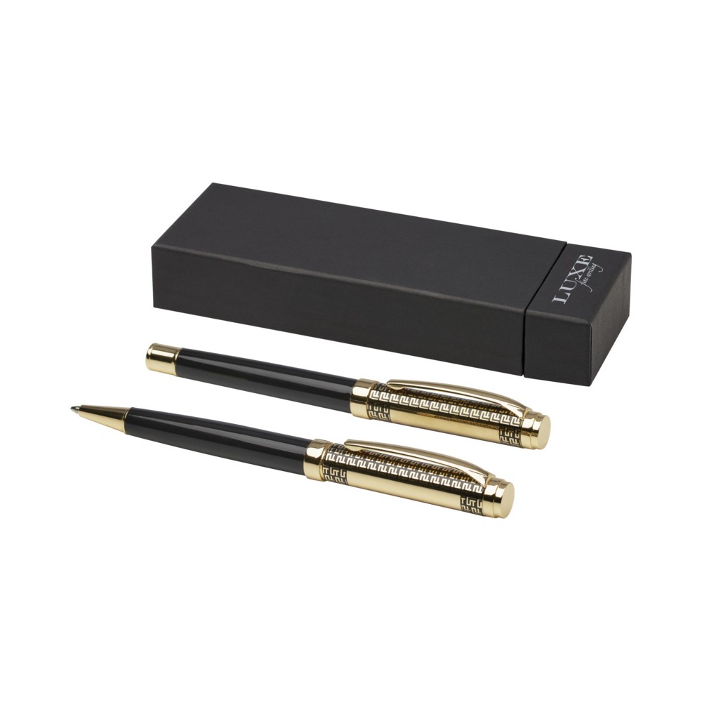 sada per Legato elegantně kombinuje kuličkové pero a kuličkové roller pero. Obě pera mají horní část těla z recyklované mosazi se zlatým chromovaným povrchem, spodní část těla s černým nástřikem, kovové zlaté chromované doplňky, logo LUXE na středním kroužku a modrý inkoust. Kuličkové pero má délku psaní 800 metrů a velikost hrotu 1,00 mm. Kuličkové pero má délku psaní 400 metrů a velikost hrotu 0,7 mm. Recyklovaná mosaz