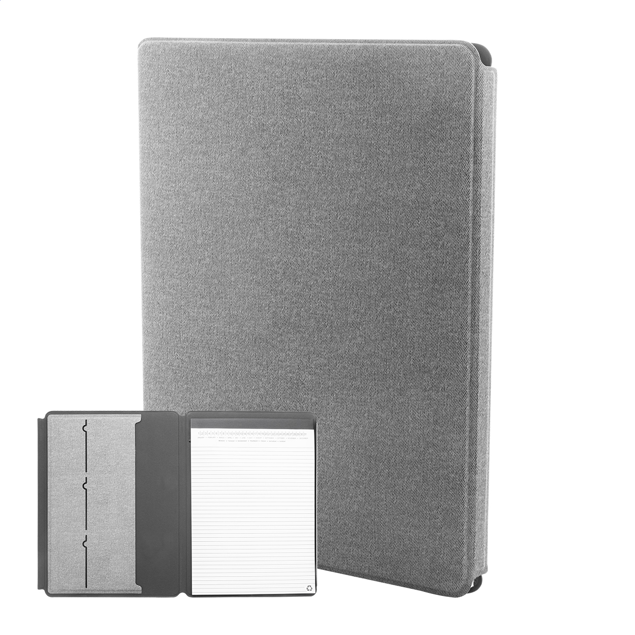 SlohaA4 na dokumenty z recyklované PU kůže s vnitřními kapsami na organizér a magnetickým zavíráním. S 20 linkovanými listy poznámkového bloku z recyklovaného papíru.