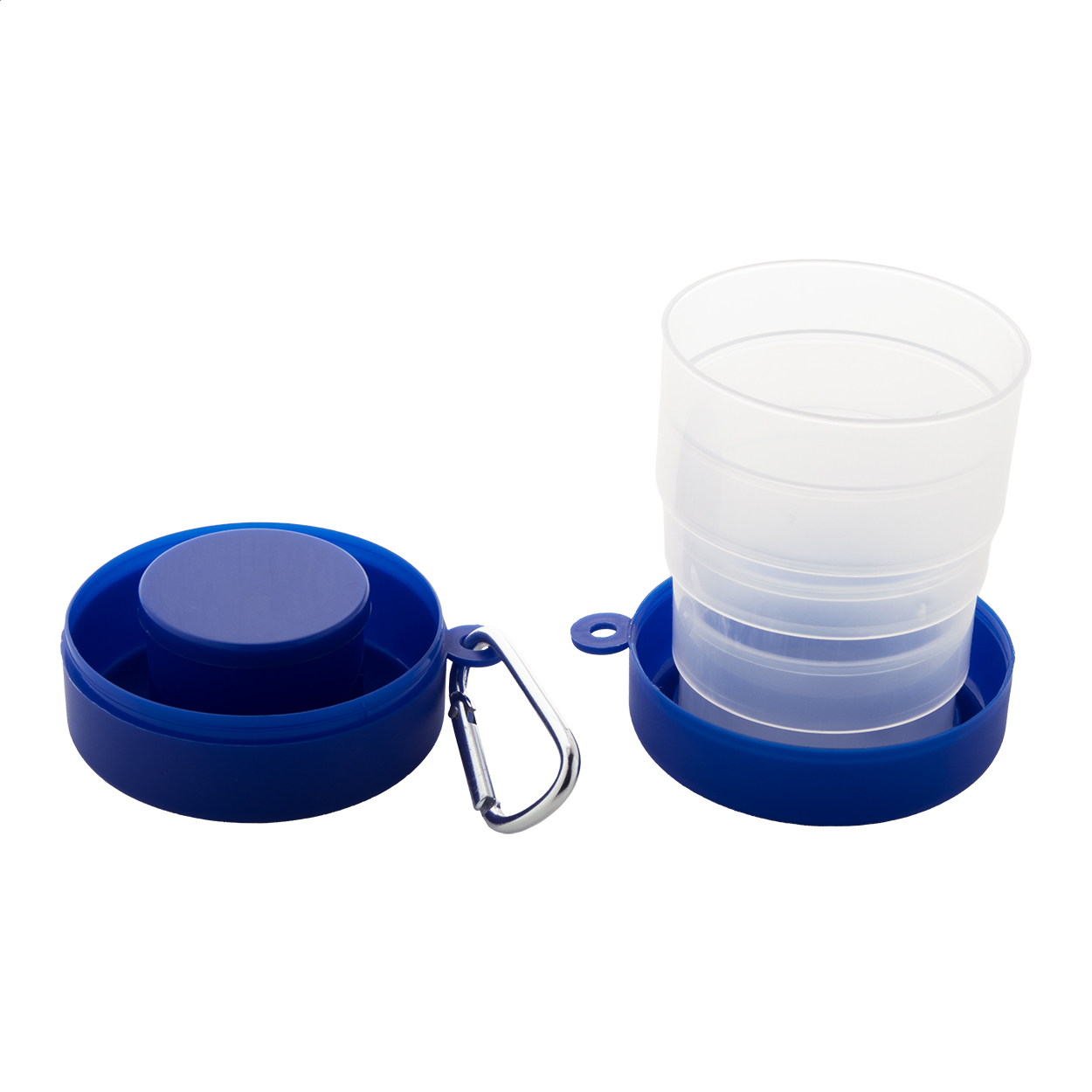 Skládací kelímek z recyklovaného PP plastu s přihrádkou na pilulky a kovovou karabinou. 220 ml. Bez BPA.