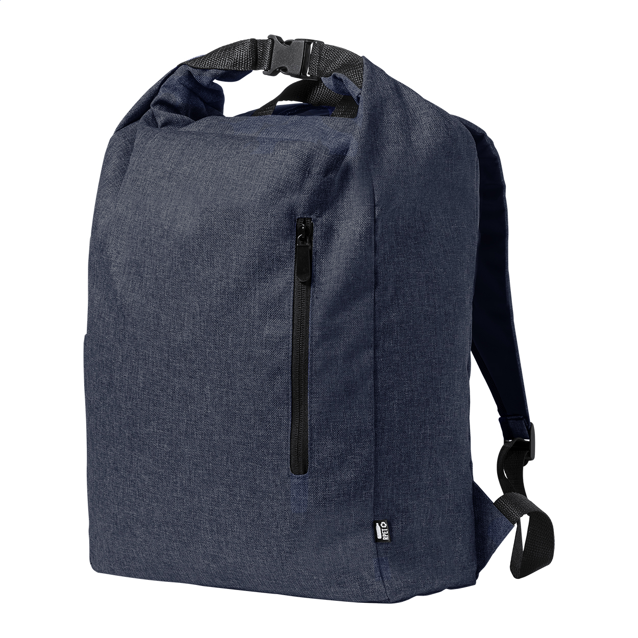Vodotěsný, rolovací batoh z RPET s boční kapsou, přední kapsou na zip, polstrovanými zády a ramenními popruhy. S výrazným štítkem RPET. Polyester 300D RPET.