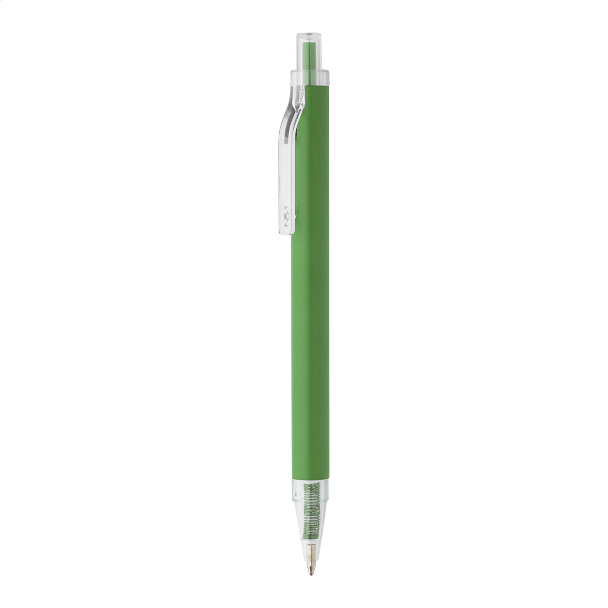 Kuličkové pero z recyklovaného hliníku s matným tělem a průhlednými RPET částmi. S modrou náplní.