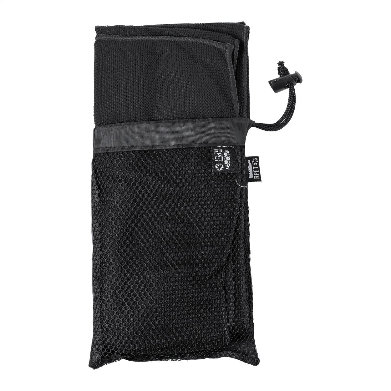 Sportovní ručník z mikrovlákna v přenosném pouzdře RPET s výrazným štítkem RPET. Polyester RPET, 160 g/m².
