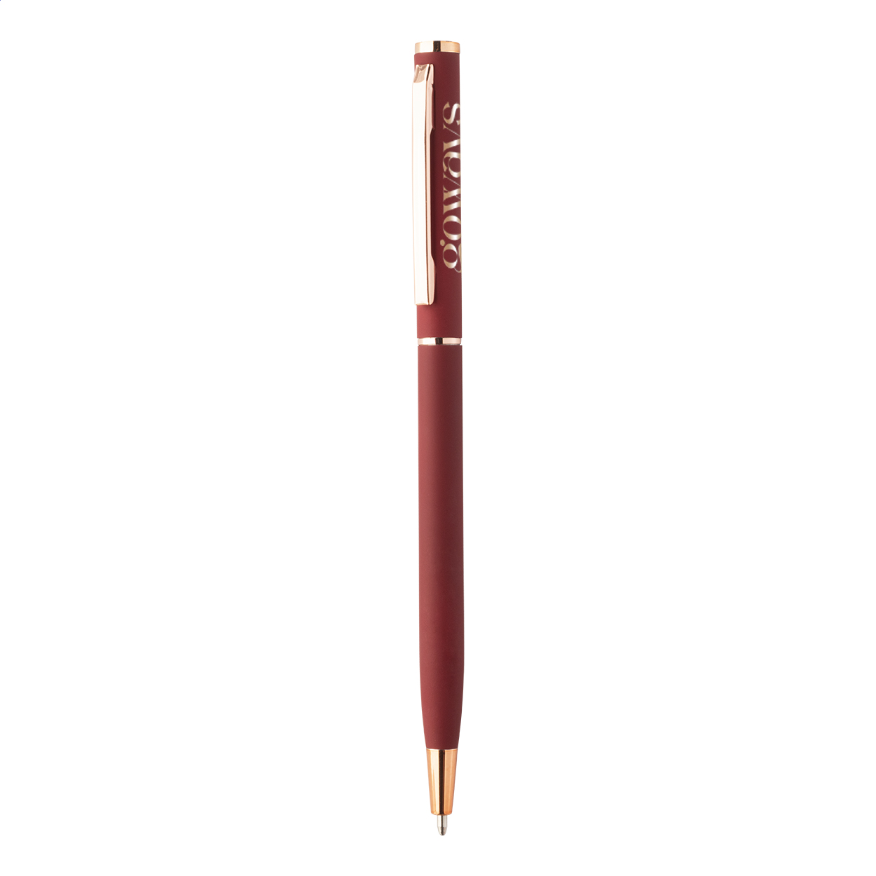 Kuličkové pero z recyklovaného hliníku s pogumovaným povrchem a detaily z růžového zlata. Se speciální povrchovou úpravou pro zrcadlové laserové gravírování v barvě růžového zlata. S modrou náplní.