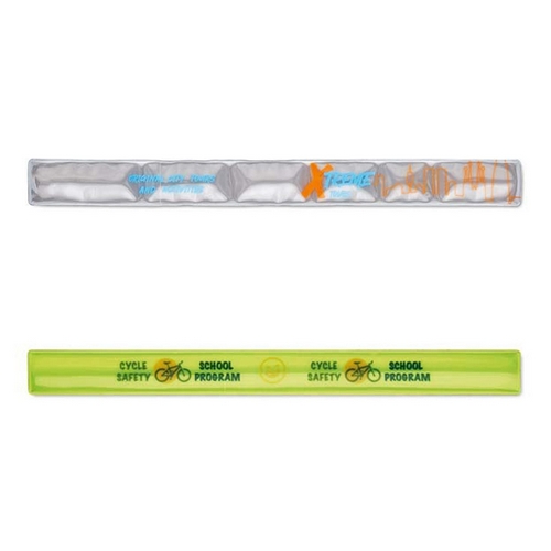 Reflexní páska žlutá nebo stříbrná, CE EN17353. PVC + ocel s černým smetovým podkladem. Možné velikosti 32×3 cm / 34×3 cm / 40×3 cm, potisk možný z vnější či vnitřní strany ( uvnitř ) – Minimální počet: 250 ks