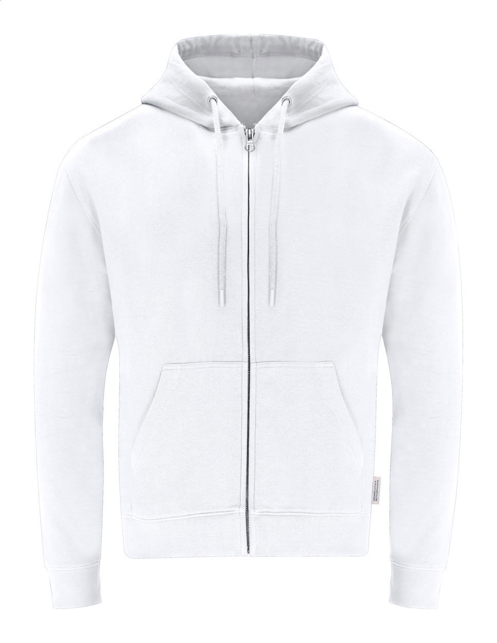 Mikina s kapucí na zip a předními kapsami ze 60% organické bavlny a 40% RPET polyesteru, 280 g/m2.