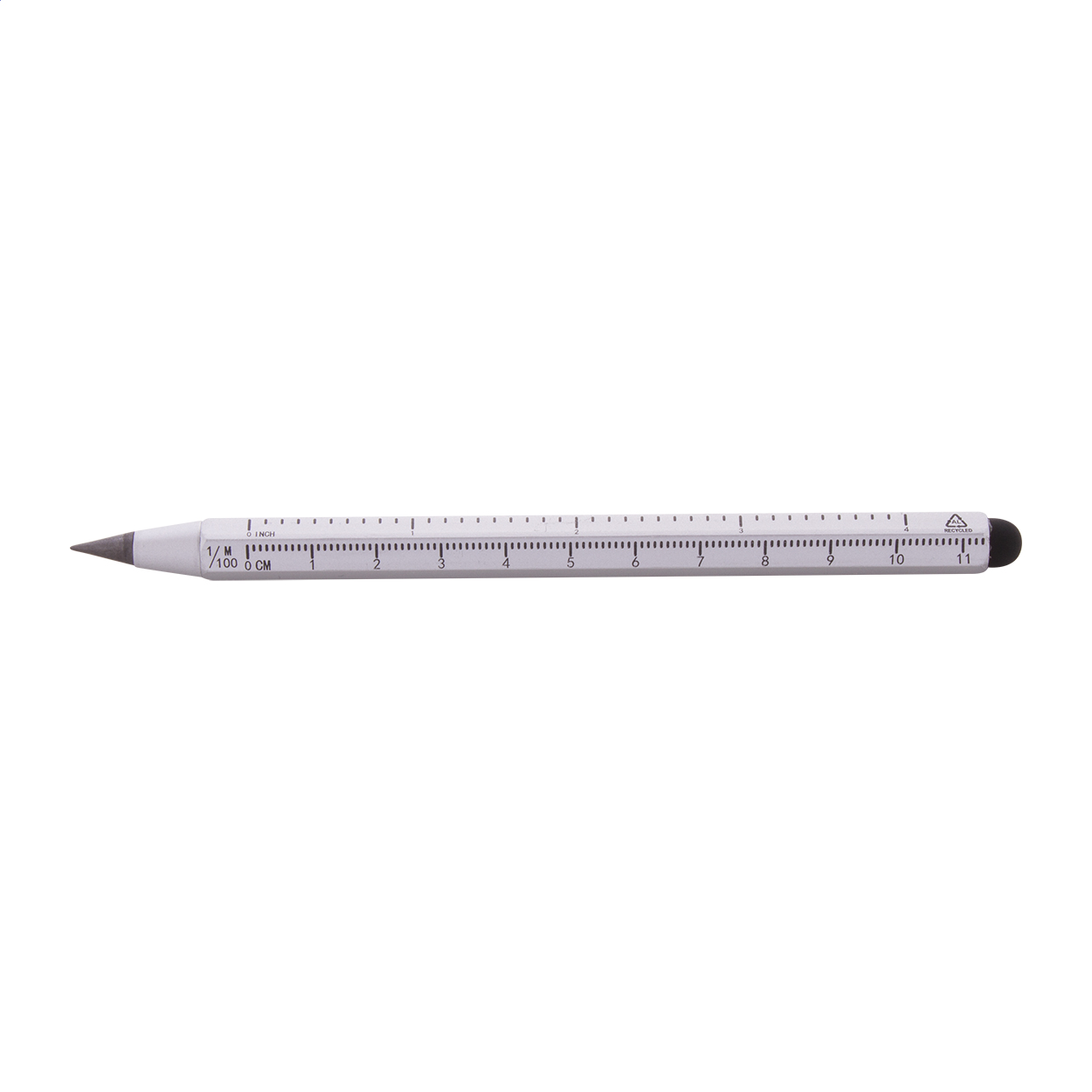 Bez inkoustové pero s dlouhou životností z recyklovaného hliníku s dotykovým stylusem a hrotem z kovové slitiny, který oxiduje papír. S šestihrannou hlavní včetně pravítek 11 cm a 4 palce. Toto pero píše podobně jako tužka a navíc je stíratelné.